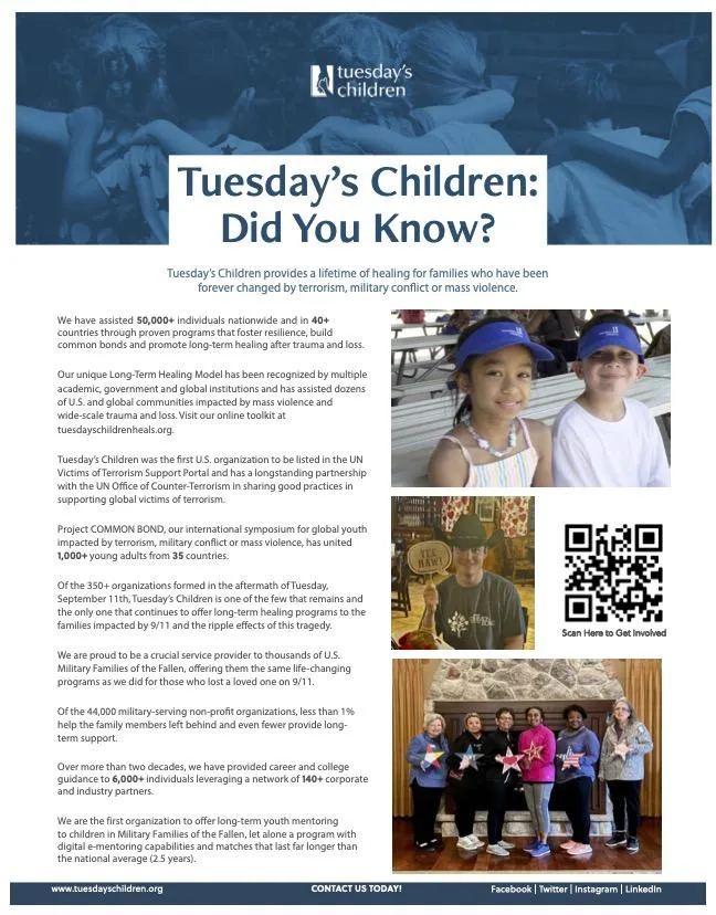"Tuesday’s Children was formed in the aftermath of the terrorist attacks of Tuesday, September 11, 2001. Our commitment to those affected that day is at the core of who we are and who we serve."